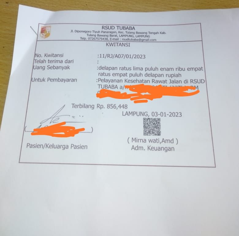 setelah selesai operasi pasien dirumah sakit Assyifa, salah satu petugas RSUD Tubaba menghubungi saya untuk menyelesaikan administrasi dirumah sakit umum daerah Tubaba dengan jumlah Rp.856,448 yang harus dibayar,saya pun menjawab ya nanti saya bayar setelah saya pulang dari Assyifa, jawab suami pasien.