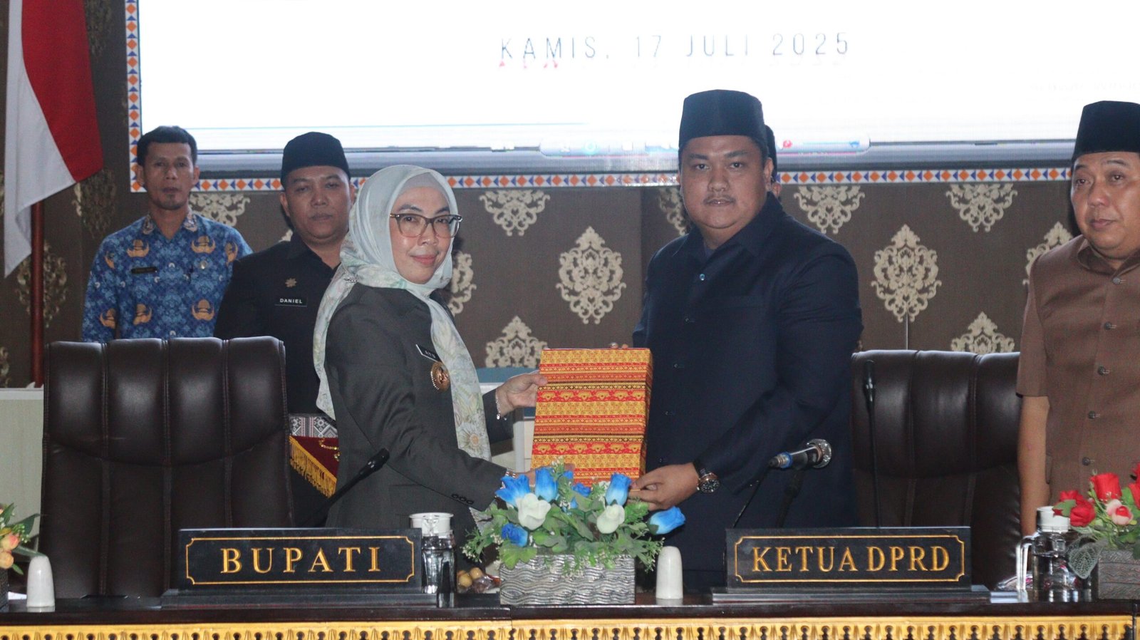 Rapat Paripurna tersebut turut dihadiri oleh unsur Forum Komunikasi Pimpinan Daerah, Penjabat Sekretaris Daerah Kabupaten, Dr. Arie Anthony Thamrin, S.STP., M.IP., CGCAE., CGRE., para Staf Ahli Bupati, Asisten Sekda, Kepala Organisasi Perangkat Daerah, para Kepala Bagian, serta Camat Blambangan Umpu. sumber : (Dinas Kominfo Kabupaten Way Kanan)