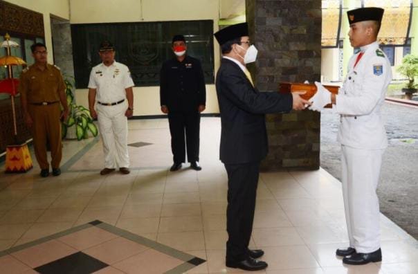 Walikota metro serahkan bendera kepada pasukan pengibar bendera pusaka(paskibraka) kota metro.
