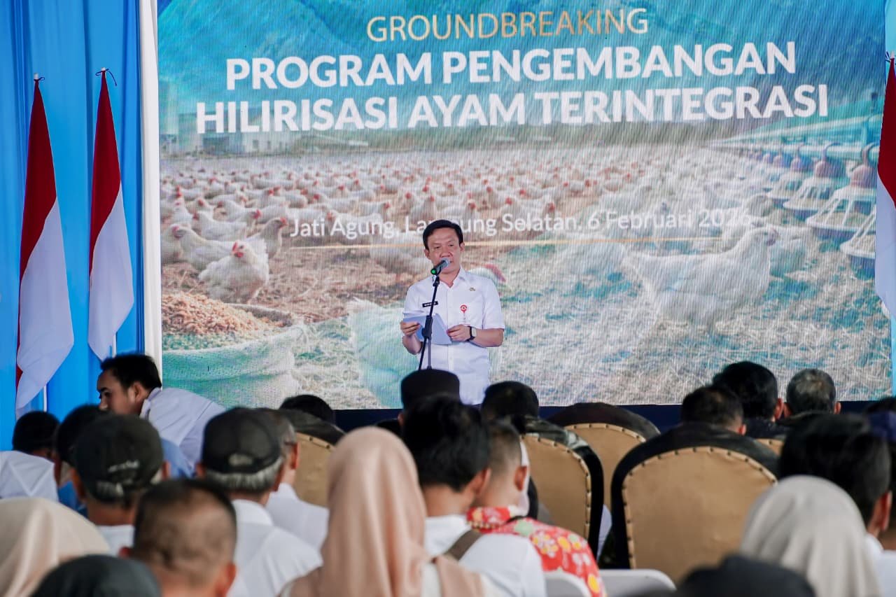 Lampung Selatan, Benualampung.com – Gubernur Lampung yang diwakili oleh Sekretaris Daerah Provinsi (Sekdaprov) Lampung, Marindo Kurniawan, melakukan Groundbreaking Program Pengembangan Hilirisasi Ayam Terintegrasi Tahun 2026 di Kebun Kedaton Trikora PTPN I Regional 7, Jati Agung, Jumat (06/02/2026).