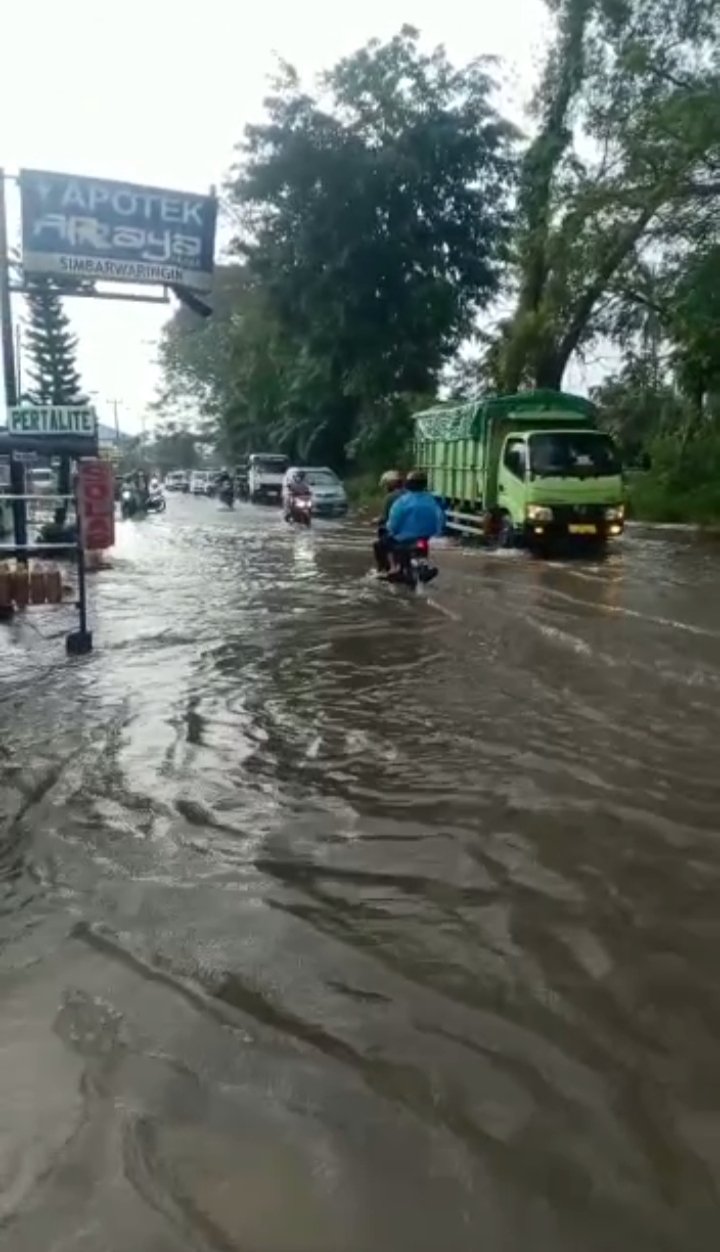 Menurut salah satu warga setempat hujan lebat sore ini yang berdurasi kurang lebih satu jam tersebut mengakibatkan air menggendang ditengah jalan hingga pengguna jalan raya roda empat maupun roda dua terhambat dan mengakibatkan kemacetan panjang