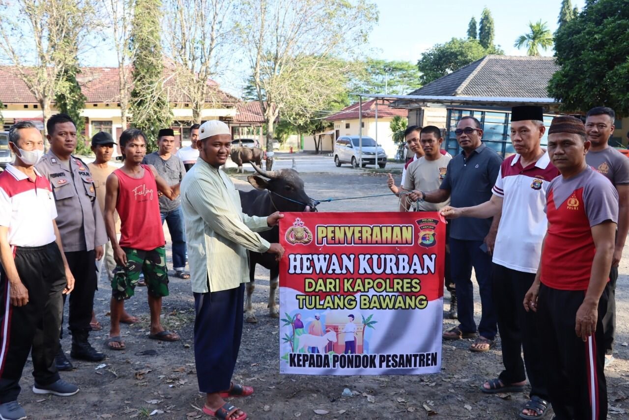 Penyerahan hewan kurban ini berlangsung hari Sabtu (09/07/2022), pukul 16.15 WIB, di Mako Polres Tulang Bawang, Polda Lampung, dan disaksikan langsung oleh para PJU Polres.