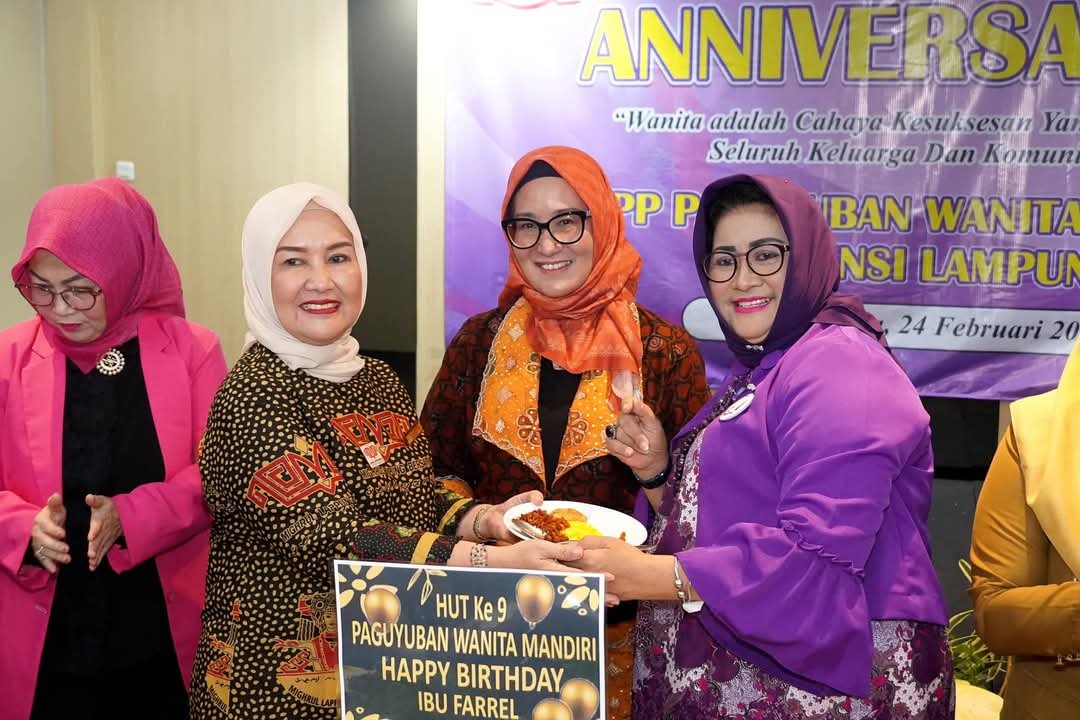 Ketua TP. PKK Provinsi Lampung Purnama Wulan Sari Mirza dalam sambutan tertulis yang dibacakan oleh Ketua Bidang III TP. PKK Provinsi Lampung Siti Fatimah Fredy menyampaikan ucapan selamat ulang tahun ke-9 DPP Paguyuban Wanita Mandiri Provinsi Lampung.