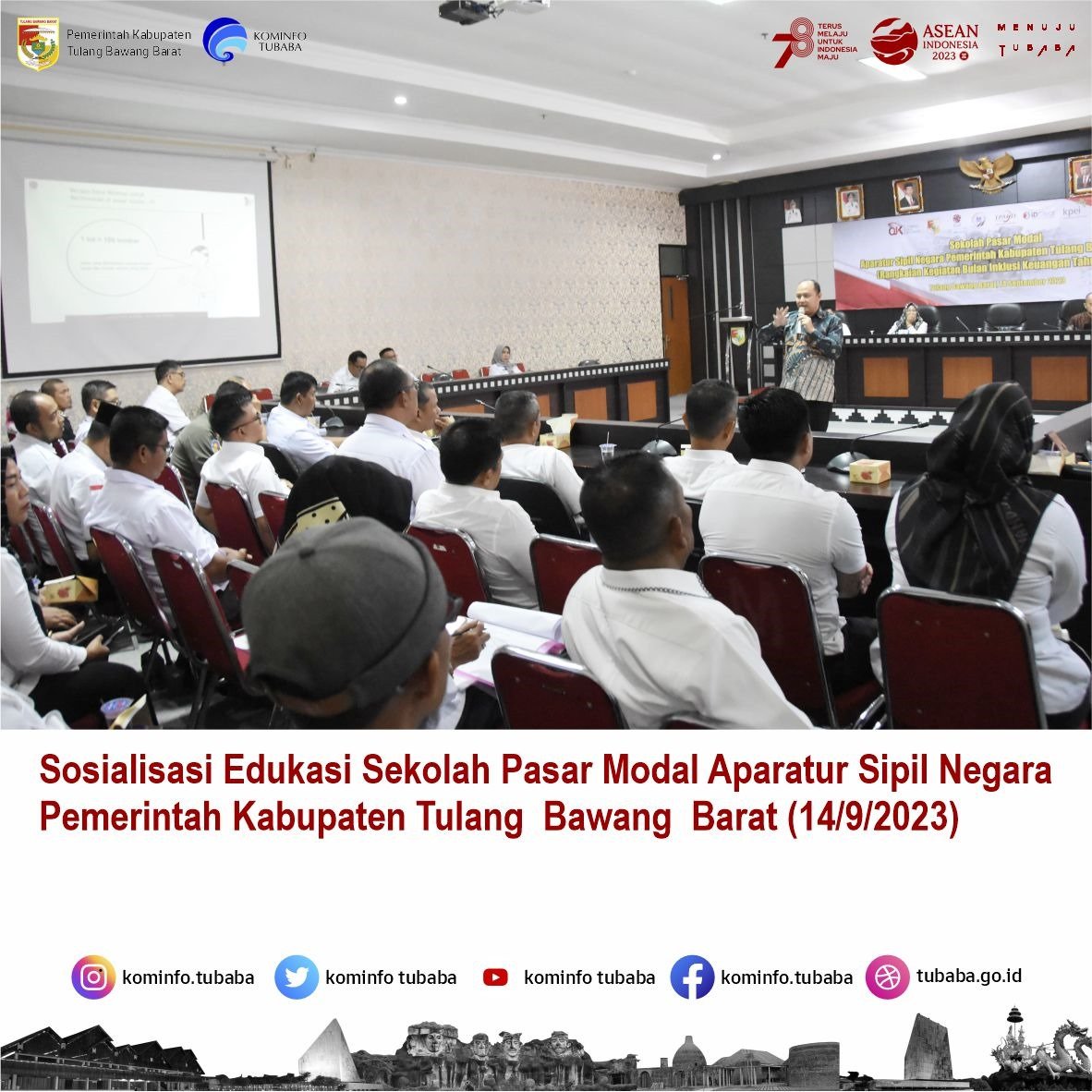 Tubaba, benualampung.com – Otoritas Jasa Keuangan (OJK) bersama Pemerintah Kabupaten (Pemkab) Tulangbawang Barat (Tubaba) menggelar Sosialisasi dan Edukasi Pasar Modal bagi para Aparatur Sipil Negara (ASN) dan Penggiat Desa/Tiyuh Inklusi Kabupaten Tubaba, yang berlangsung di Ruang Rapat Bupati, Kantor Pemda kabupaten setempat. Kamis, (14/09/2023).