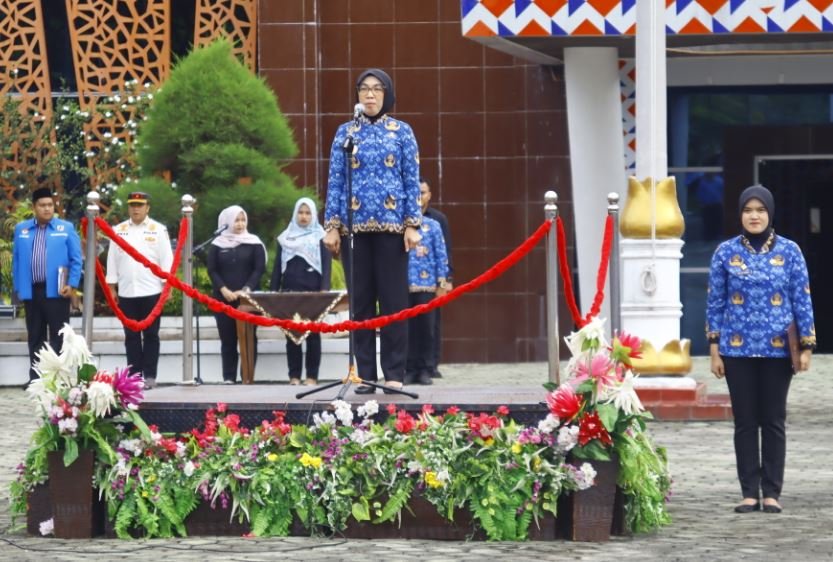 Bupati Way Kanan, Ayu Asalasiyah, S.Ked., bertidak selaku Pembina Upacara membacakan sambutan Menteri Pemuda dan Olahraga Republik Indonesia, Erick Tohir.