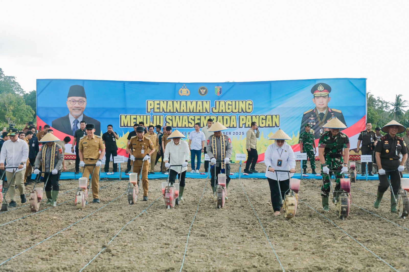 Kegiatan penanaman jagung menuju swasembada pangan dipusatkan di lahan pertanian SMA Kebangsaan, Desa Pisang, Kecamatan Penengahan, Kabupaten Lampung Selatan, Selasa (2/12/2025), dihadiri oleh Kakorlantas Polri Irjen Pol. Agus Suryonugroho, Kapolda Lampung Irjen Pol. Helfi Assegaf, Pangdam II/Sriwijaya, Bupati Lampung Selatan, serta jajaran Forum Komunikasi Pimpinan Daerah (Forkopimda) Provinsi Lampung.