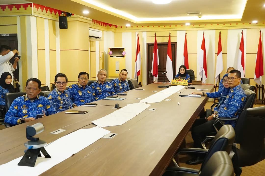 Bandar Lampung, Benualampung.com – Wakil Gubernur Lampung, Jihan Nurlela mengikuti Rapat Koordinasi Penyelenggaraan Pemerintahan Daerah dan Penandatanganan Nota Kesepahaman Tentang Sinergi Tugas dan Fungsi di Bidang Agraria, Pertanahan, Pemerintahan Dalam Negeri, Kehutanan, Transmigrasi dan Informasi Geospasial, serta Pemeriksaan Kesehatan Gratis dan Implementasi Pembangunan 3 Juta Rumah secara virtual bertempat di Ruang Rapat Sakai Sambayan Kantor Gubernur, Senin (17/03/2025).