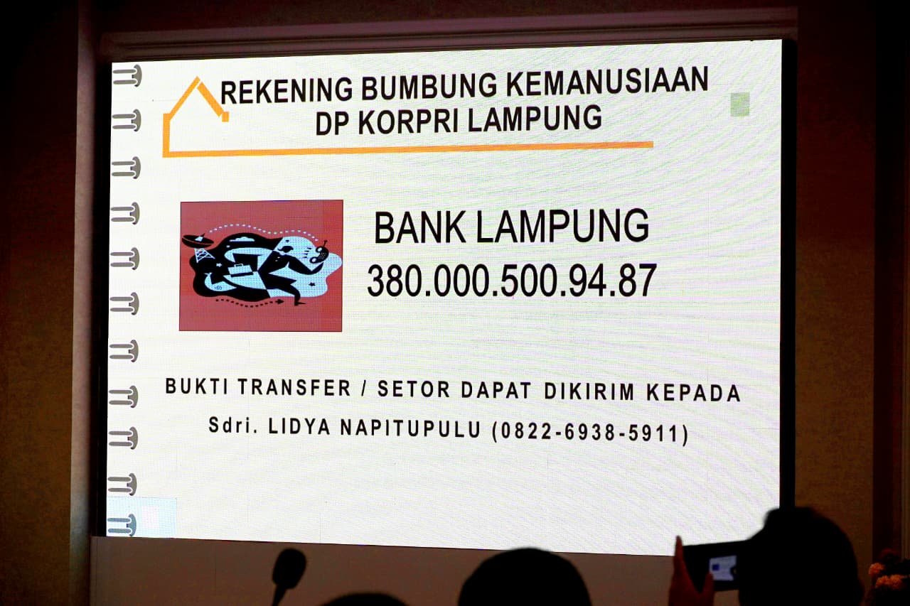 Adapun sumbangan dapat disalurkan melalui rekening Bank Lampung dengan Nama Bumbung Kemanusiaan DP Korpri Lampung, dengan Nomor Rekening : 380-000-500-9487 sebagai pusat penyaluran bantuan dan diproyeksikan menjadi kanal utama donasi dari ASN dan masyarakat Lampung.
