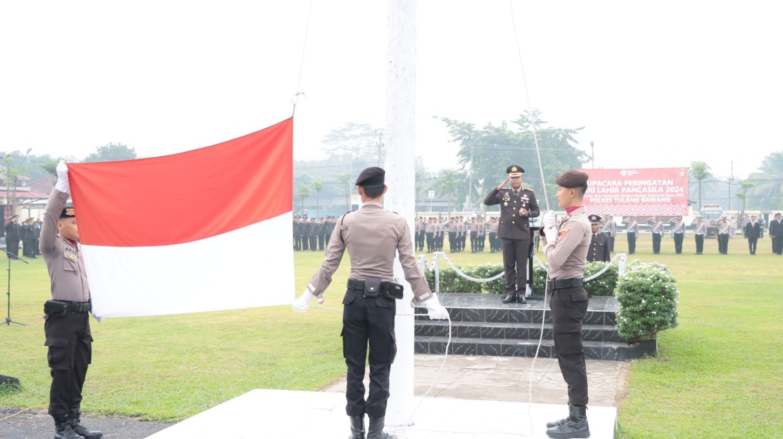 “Pancasila harus senantiasa kita jiwai dan dipedomani agar menjadi ideologi yang bekerja, yang dirasakan kehadiran dan manfaatnya oleh seluruh tumpah darah Indonesia,” kata Kapolres Tulang Bawang, Polda Lampung, AKBP James H Hutajulu, SIK, SH, MH, MIK, membacakan pidato Kepala Badan Pembinaan Ideologi Pancasila Republik Indonesia, Yudian Wahyudi, saat memimpin langsung Upacara Peringatan Hari Lahir Pancasila, Sabtu (01/06/2024), pukul 08.00 WIB, di lapangan Mapolres setempat.