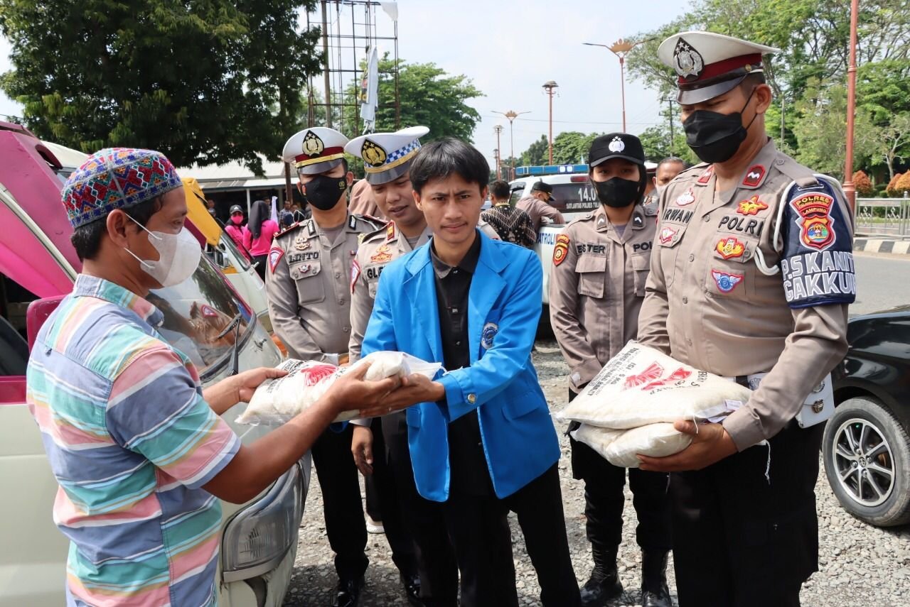 Tulang Bawang Lampung, benualampung.com – Polres Tulang Bawang, Polda Lampung, bersama mahasiswa dari Universitas Megou Pak Tulang Bawang (UMPTB) membagikan bantuan sosial (bansos) kepada supir angkutan kota (angkot) dan tukang ojek yang terdampak kenaikan harga bahan bakar minyak (BBM) subsidi.