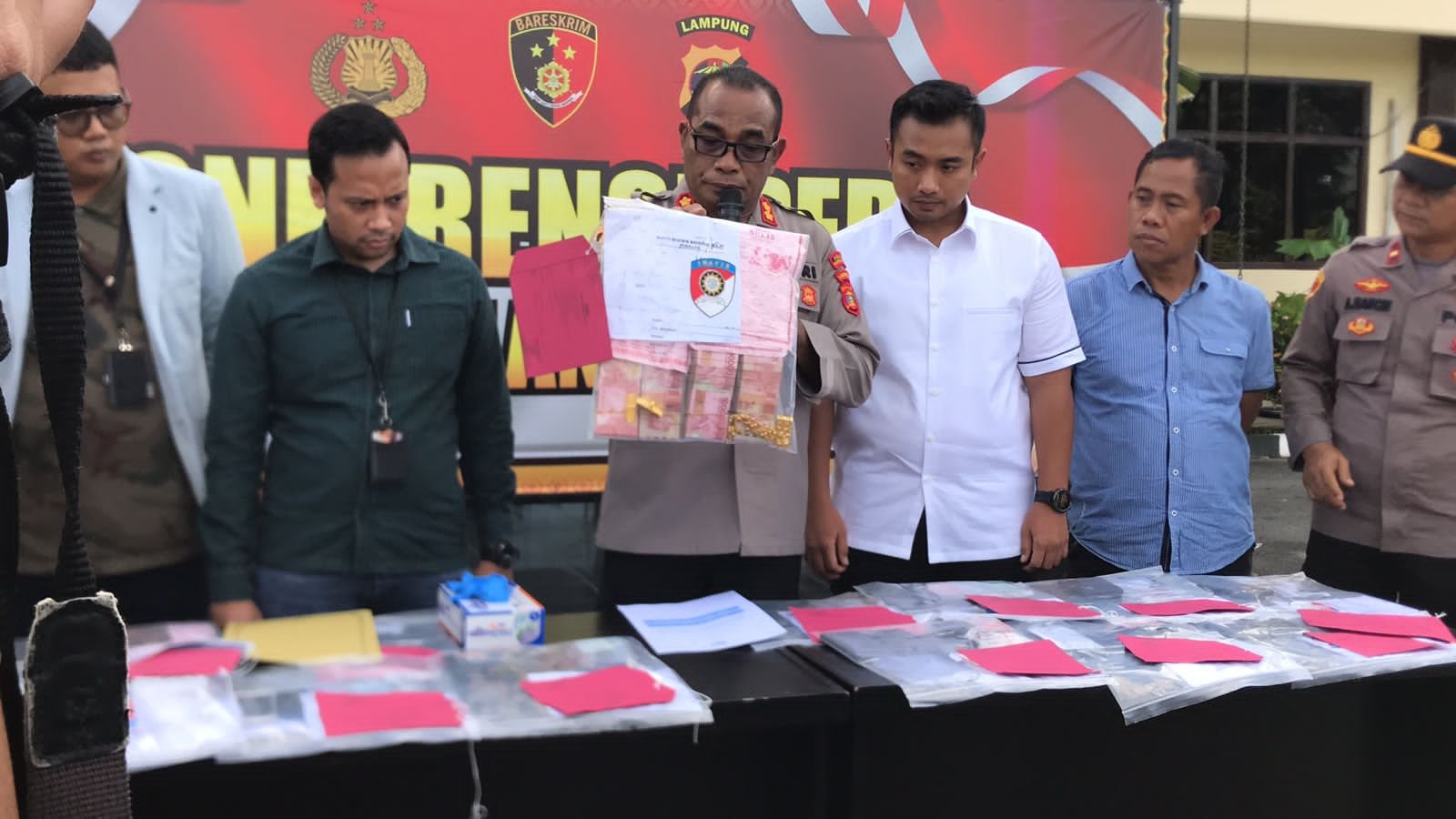 Dari tangan para pelaku, lanjut AKBP Hujra, petugasnya berhasil menyita barang bukti (BB) berupa 19 unit handphone (HP), 55 buah sim card, kotak HP, tas, uang tunai sebanyak Rp 4.377.000,- (empat juta tiga ratus tujuh puluh tujuh ribu rupiah), dan 80 gram emas.