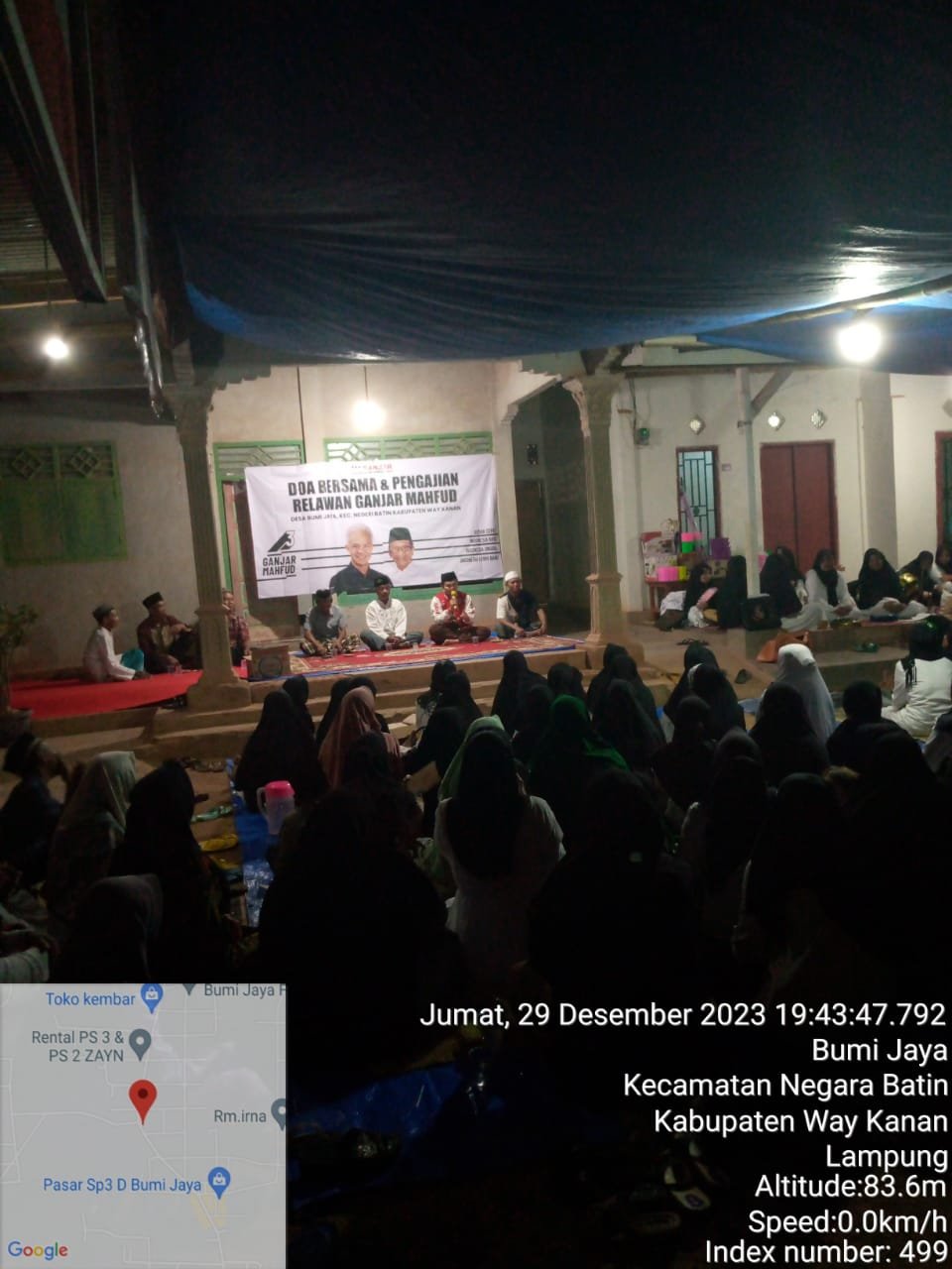 WAY KANAN, benualampung.com – Relawan Ganjar – Mahfud Kabupaten Way Kanan mengadakan acara doa bersama dan pengajian bersama Masyarakat yang dilaksanakan di kediaman Bapak hanifudin selaku tokoh agama di kampung Wijaya Kecamatan Negara Batin hadir pada kegiatan tersebut sekitar 200 warga. Jum’at 29 Desember 2023.