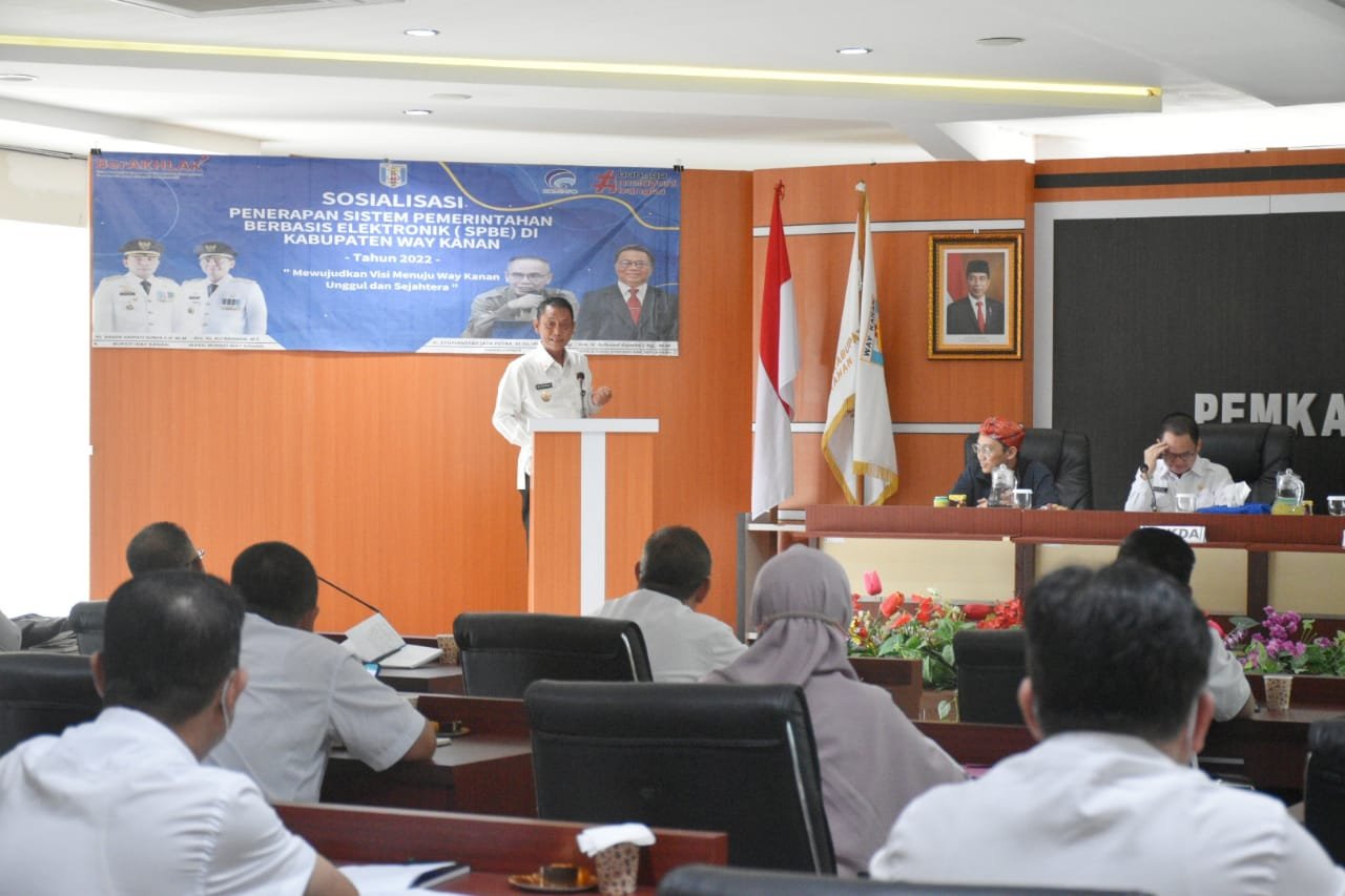 WAY KANAN, benualampung.com – Wakil Bupati Drs. H. Ali Rahman, M.T didampingi Sekretaris Daerah Kabupaten, Saipul, S.Sos.,M.IP menghadiri Sosialisasi Penerapan Sistem Pemerintahan Berbasis Elektronik (SPBE) di Kabupaten Way Kanan Tahun 2022 di Ruang Rapat Utama Pemkab setempat, Kamis (09/06/2022) yang dihadiri oleh Ir. Syopiansyah Jaya Putra, M.Sis, IPU ASEAN Eng dan Maizano Ardhi Muhammad, S.T.,M.T, selaku narasumber.