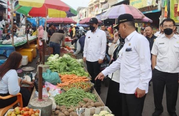Wakil Walikota Metro Qomaru Zaman meninjau penyelenggaraan operasi pasar yang berlangsung di dua lokasi.