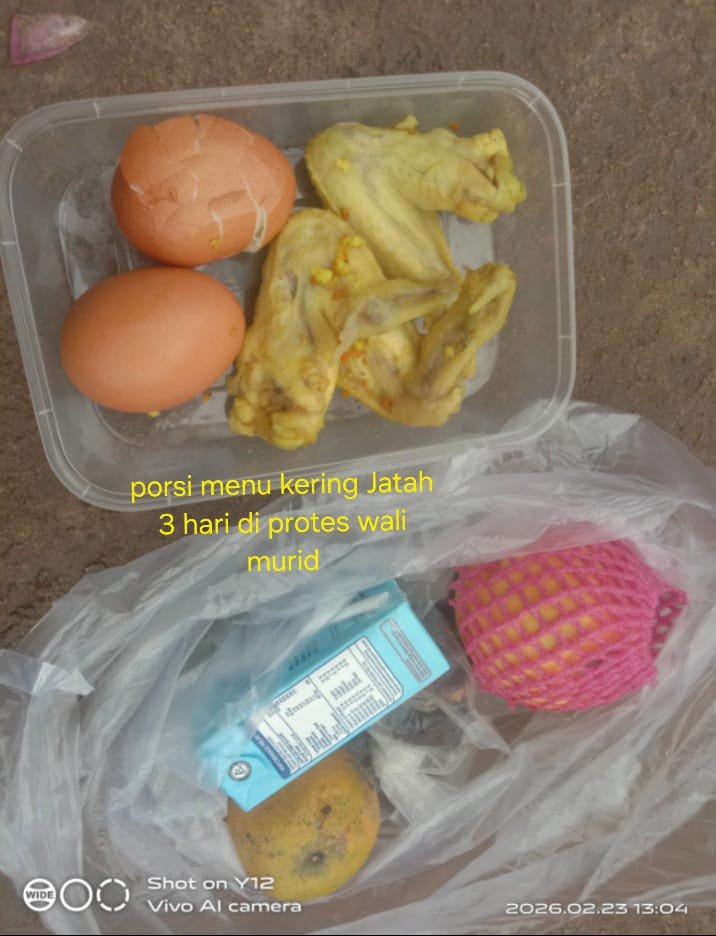 isinya cuma: 2 butir telur rebus, 2 sayap ayam, 1 susu kotak, 1 buah apel, 1 buah jeruk, dan 3 butir kurma. sangat jauh dari harapan untuk mendukung pemenuhan gizi anak,” kata sejumlah wali murid pada Senin (23/02/2026)