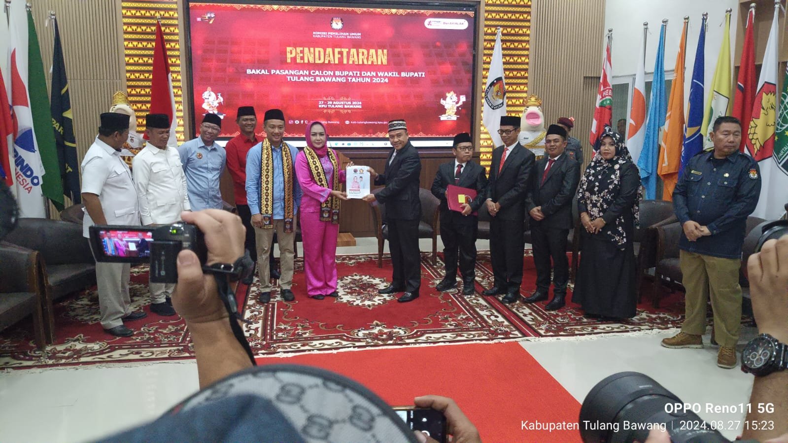 Tulang Bawang, benualampung.com – Pasangan Bakal Calon kepala Daerah Bupati dan Wakil Bupati Tulang Bawang periode 2024 -2029 Winarti – Reynata Irawan (WINATA), Menjadi pasangan Calon Yang Pertama untuk menyerahkan berkas pendaftaran secara Langsung di kantor Komisi Pemilihan Umum (KPU). Jalan lintas Timur, Menggala, Tulang Bawang. Hari Selasa (27/08/2024).